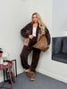 Комплект от качествена, приятна на допир материя. Горнището е с широк силует, качулка, джобове и ръкави с маншети. Панталоните са свободни с висока талия и удобни джобове, осигурявайки комфорт и стил за всекидневно носене.